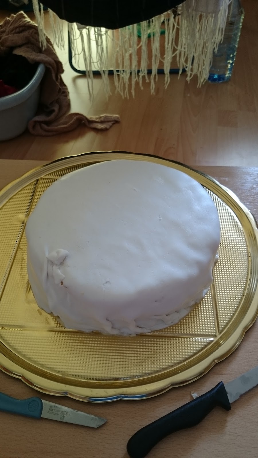 ژان كرم كيك رو حاضر كرد و هم من بعد از پختن كيك و اضافه كردن كرم و موز در بين سه لايه كيك، سپردمش دست ژان تا روش رو با پيست شكر بپوشونه و خودم رفتم سر كار